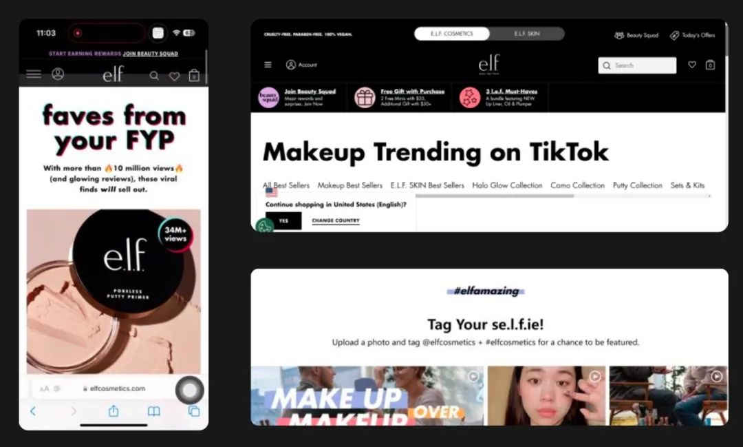 For example, the beauty brand e.l.f has long adhered to industry innovation and created cultural trends. On official website, the brand of e.l.f, users can see the make up trending on TikTok and related beauty products. E.l.f. also launched UGC interaction to encourage users to post makeup photos after using E.L.F products in TikTok, and jointly lead the influence of beauty trends.